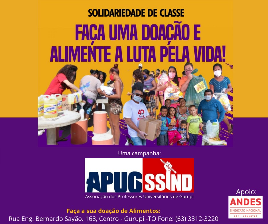A Seção Sindical Apug-Ssind está ´promovendo uma campanha de solidariedade entre os professores da Unirg, visando arrecadar alimentos para que possam ser montadas várias cestas básicas para doar a população carente da cidade. A Apug escolheu o Setor Industrial, que fica distante do centro da cidade, na zona rural, para doar as cestas que foram arrecadadas.