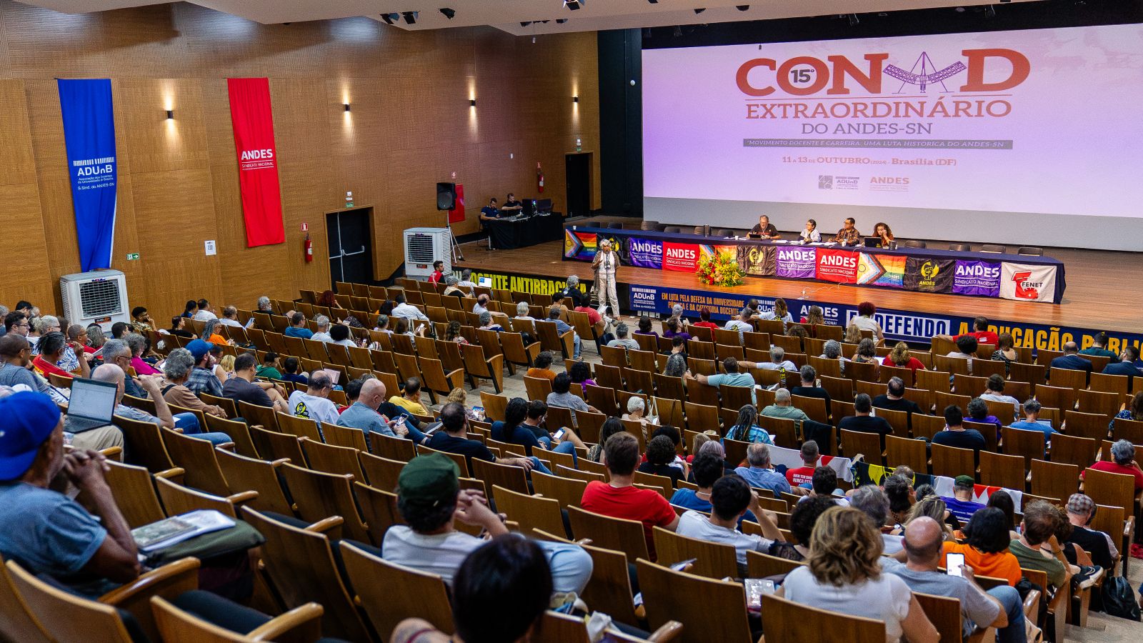 Com a proposta de debater tema único: “Movimento Docente e Carreira – Uma luta histórica do ANDES”, está acontecendo em Brasilia-DF, na sede da ADunB – Associação dos Docentes da Universidade de Brasília, o 15º Congresso Extraordinário do ANDES – SN, com a presença de mais de 240 docentes, entre delegadas(os), observadores(as) e diretoria nacional do Sindicato Nacional, tendo como pauta única, a atualização do projeto de carreira docente do Sindicato Nacional.11_10 15 CONAD EXTRAORDINARIO - MESA DE CONJUNTURA-104 (1)
