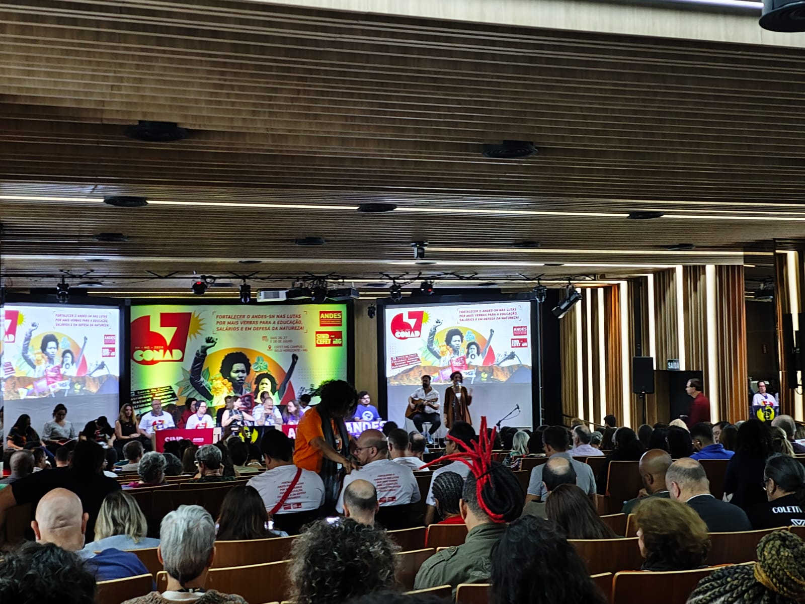 Começou na manhã desta sexta-feira (26/07) e encerra no domingo, o 67º Congresso Nacional Administrativo do ANDES – SN – CONAD, que tem como tema “Fortalecer o Andes-SN nas lutas por mais verbas para a Educação, salários e em defesa da natureza”. O evento está acontecendo no Campus 1 do Centro Federal de Educação Tecnológica de Minas Gerais, na capital Belo Horizonte, com presença de representantes de seções sindicais de todo o Brasil.WhatsApp Image 2024-07-26 at 10.23.49 (3)