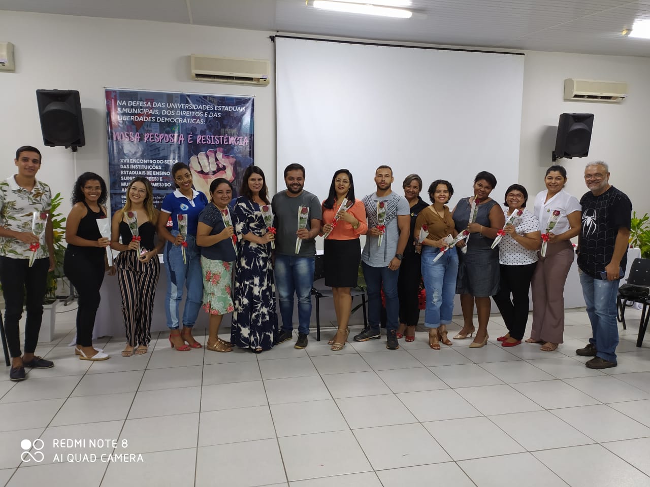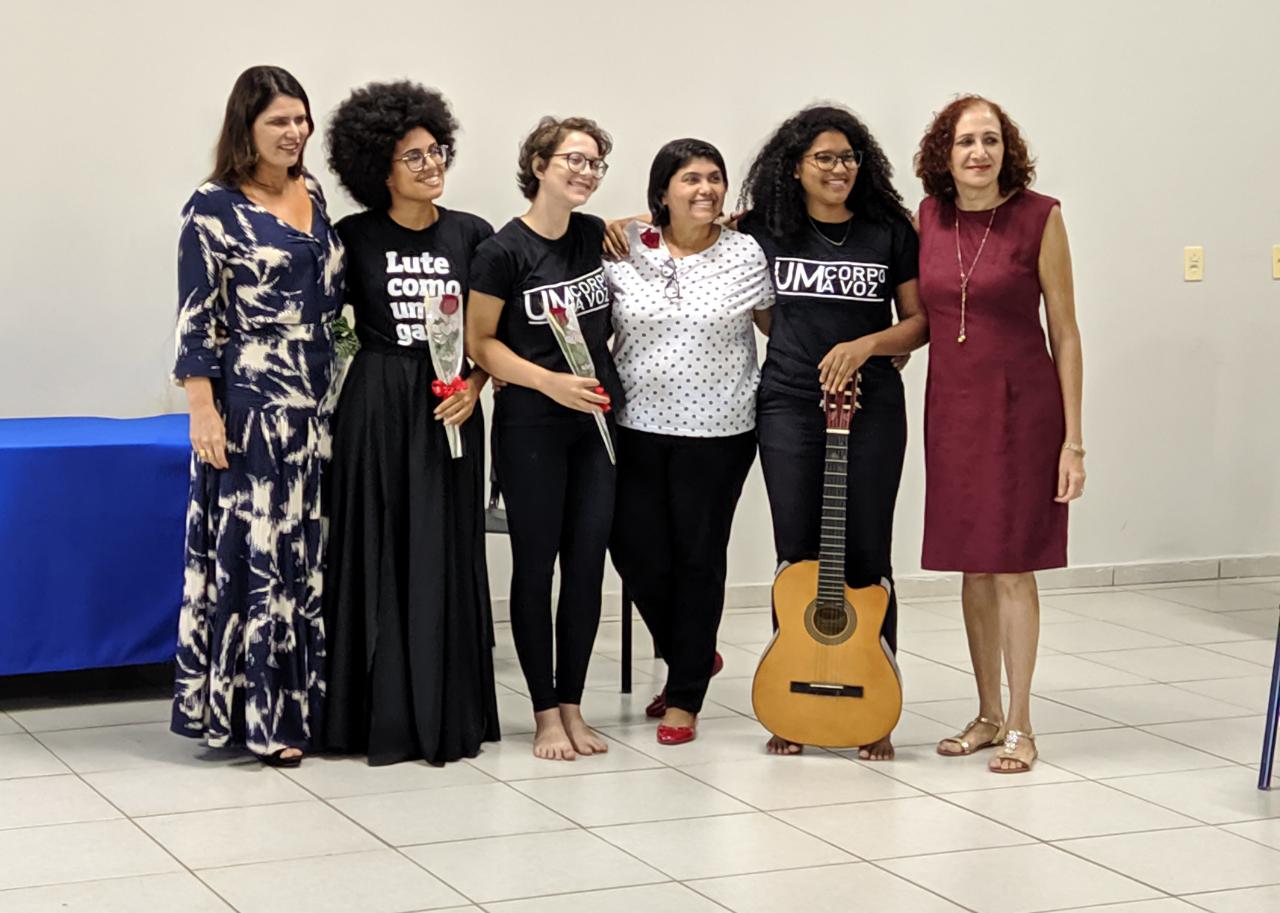Foi com a apresentação do Coletivo Um Corpo, Uma Voz, que se iniciou o evento realizado pela APUG referente ao Dia Internacional da Mulher. O coletivo composto por Rayssa Alves e Adriana Souto, com participação de Ayalla Teixeira, retrata a vida e as lutas femininas por meio de música, dança e teatro.
