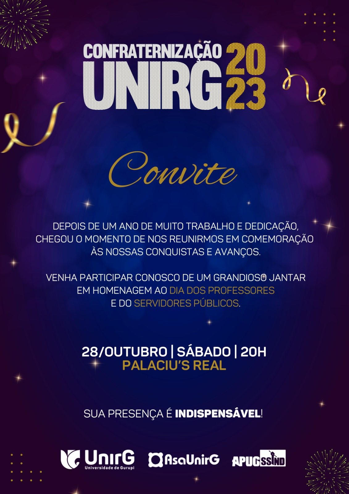 Neste sábado, dia 28, Dia do Servidor(a) Público a Apug Ssind em parceria com a Asaunirg e UnirG realizam um jantar de confraternização para todos e todas. O jantar acontecerá no Palaciu´s Real, a partir das 20h. Será uma homenagem também a todos os professores e professoras e aos servidores públicos.