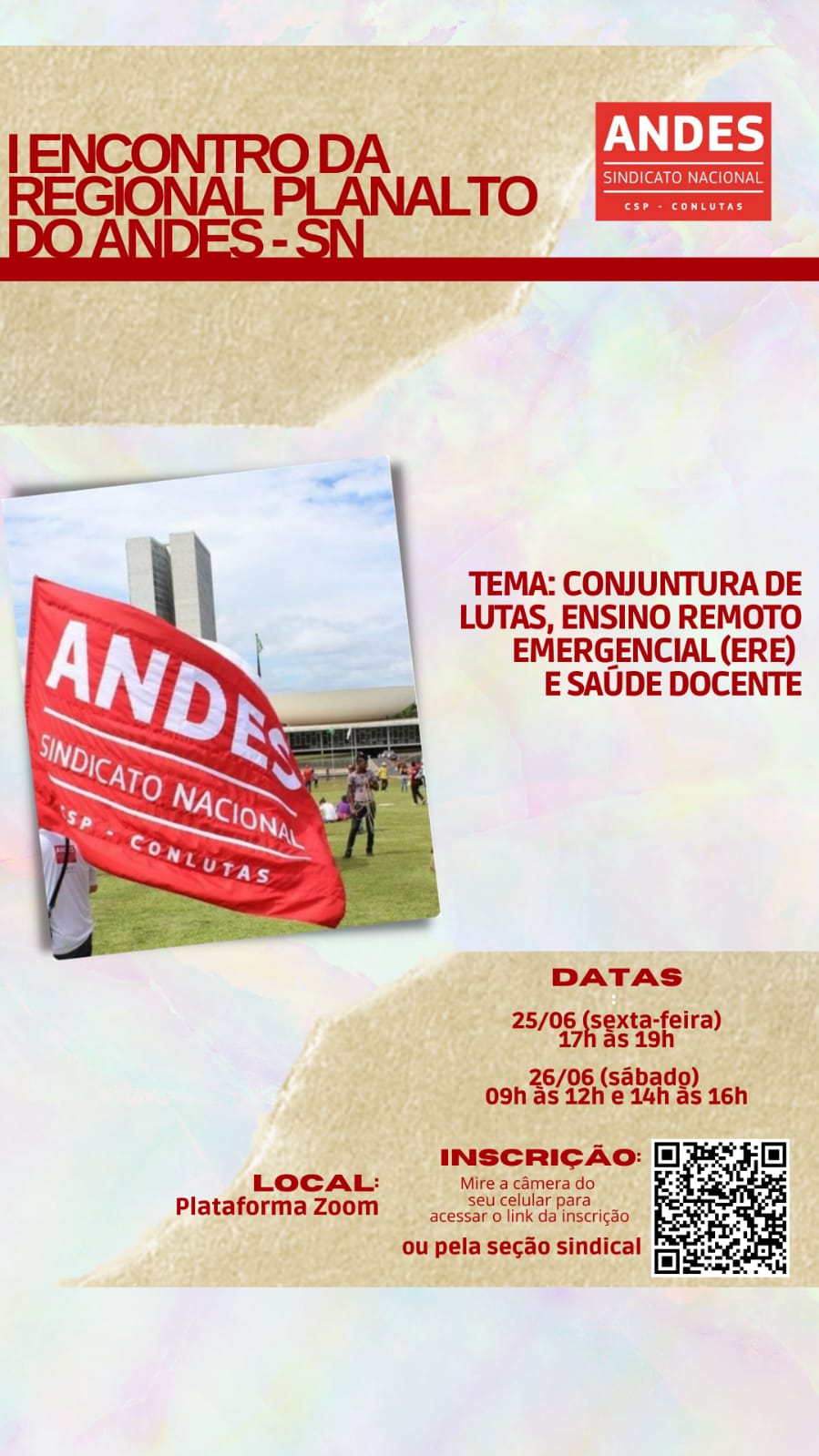 Na abertura o tema será As lutas do Andes-SN na conjuntura atual e os impactos do ERE na saúde docente, e a mesa dos debates terá a presença da profa. Rivânia Moura de Assis, presidenta do Andes, o prof. e médico Antônio Gonçalves Filho, ex-presidente do Andes e a profa. Neila Nunes de Souza, 1ª Vice-Presidenta da Regional Planalto.