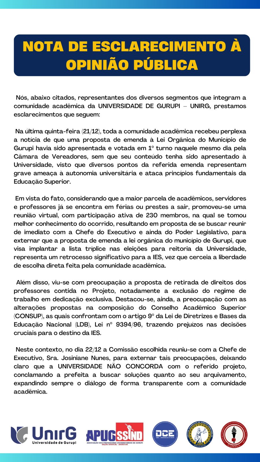 Gurupi havia sido apresentada e votada em 1º turno naquele mesmo dia pela Câmara de Vereadores, sem que seu conteúdo tenha sido apresentado à Universidade, visto que diversos pontos da referida emenda representam grave ameaça à autonomia universitária e ataca princípios fundamentais da Educação Superior.