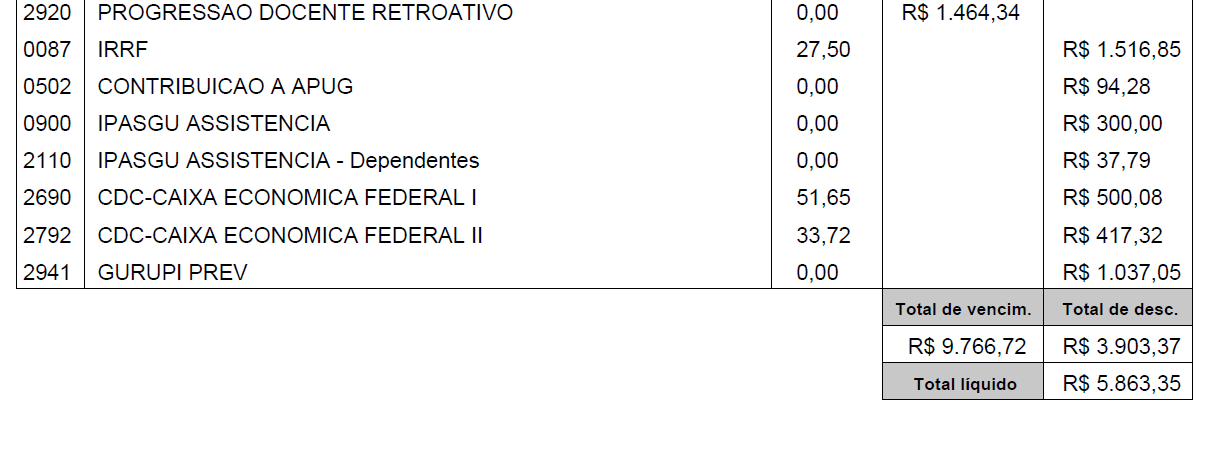A APUG-SSind encaminhou um ofício ao Presidente Sávio, apontando vários problemas na forma como dá publicidade aos salários dos professores. Uma delas é justamente a de não discriminar a que corresponde o valor total expresso. Uma pessoa leiga ou um cidadão qualquer pode olhar os valores e formar opinião de que o salário seja, de fato, aquilo que lá está. O caso de Prof. Santo Reni ajuda a ilustrar o problema. Vejamos: no mês de maio, consta-lhe um salário bruto de R$ 12.259,92 e líquido de R$ 8.989,11. Ora, se neste valor está embutido o salário do mês anterior, isso deveria estar transparente ali. O mesmo ocorrerá com quem passa a receber valores retroativos, como no caso das progressões. Em outubro de 2012, 52 professores ganharam direitos a valores retroativos de progressões atrasadas. Em cada caso, haverá um valor total, cuja especificação só se encontra no contracheque e na Folha de Pagamento. Faltou, portanto, no referido Portal, mostrar que tudo pode não ser salário normal.